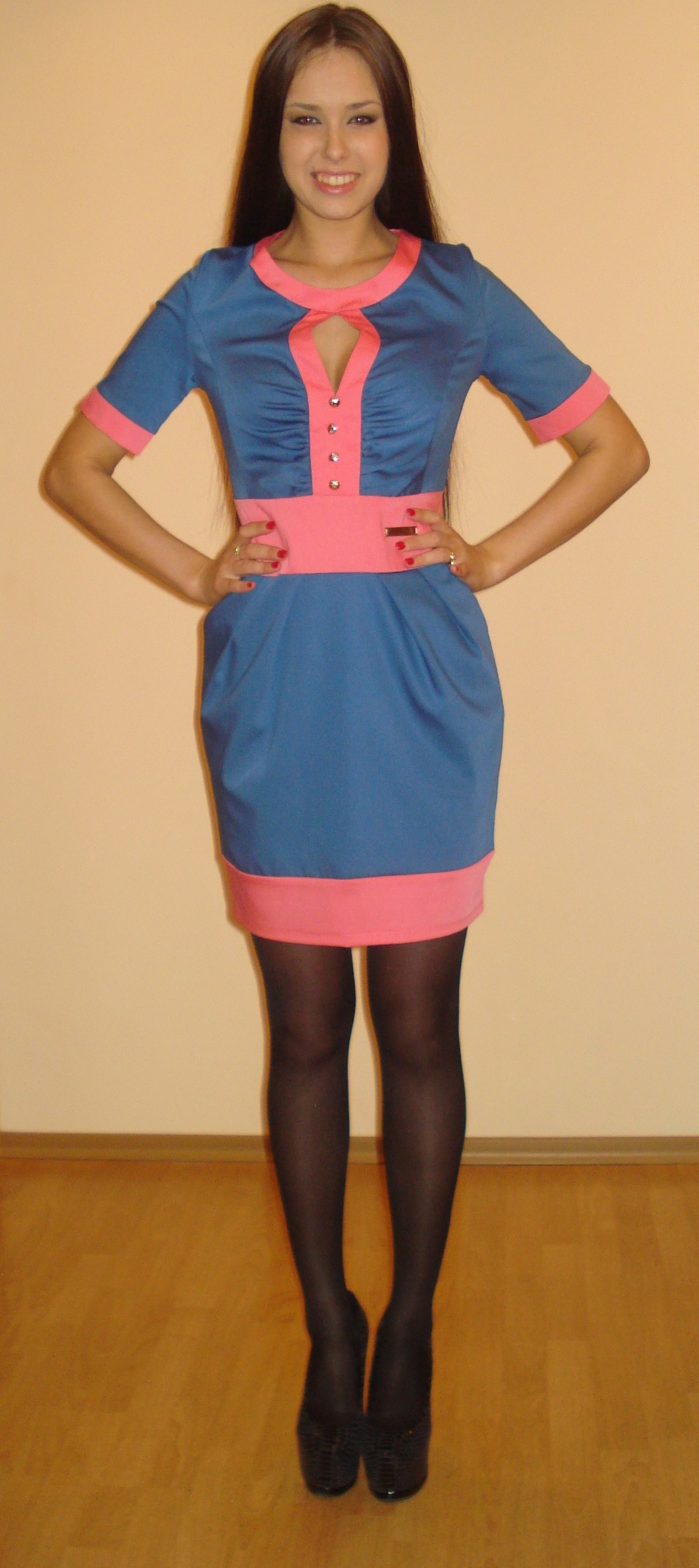 Ткань: костюмная облегченная. Элегантные платья голубого-джинсового цвета, комбинированные с коралловым и розовым цветами. Вырез в форме «слезки» переходит в планку с пуговицами, вдоль планки сборка