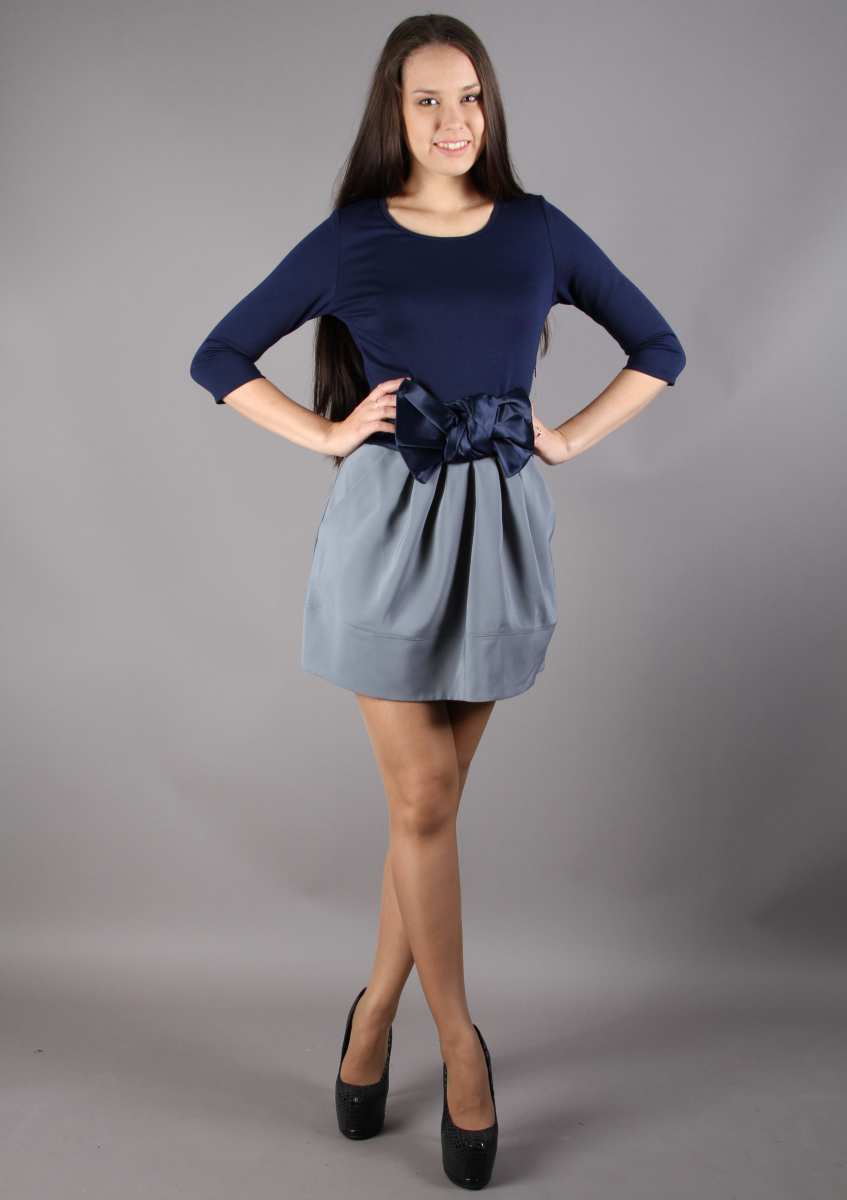 Вверх платья выполнен из трикотажа,юбка со складками и карманами из ткани тиар,пояс притачной,соединяющий верхнею часть с нижней.Спереди бант.