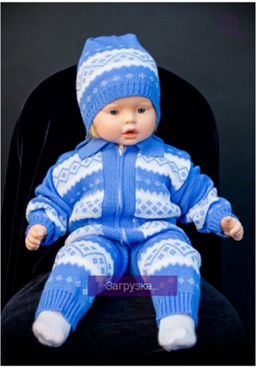 Костюм-тройка состоит из: штанишек, шапки с завязками на затылке и кофты на молнии. Дополнен норвежским узором.
