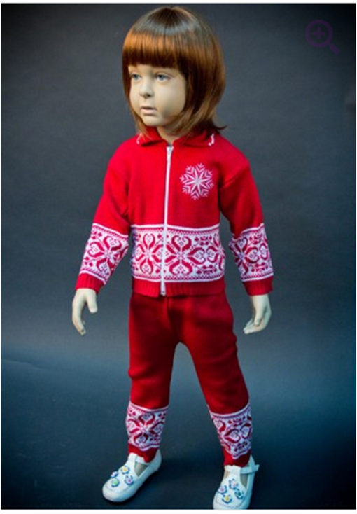 Костюм-двойка состоит из: штанишек, и кофты на молнии. Дополнен снежинкой на груди и норвежскими узорам