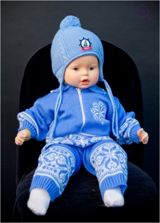 Костюм-двойка состоит из: штанишек, и кофты на молнии. Дополнен снежинкой на груди и норвежскими узорами