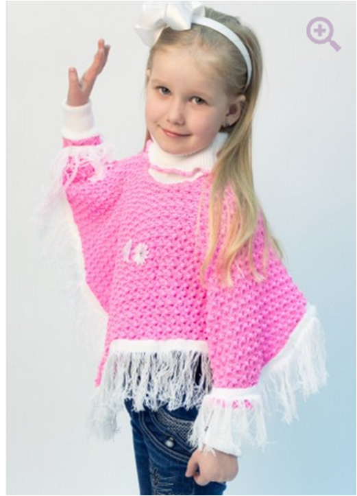 Пончо с высоким воротником, рукавами и контрастной бахромой. Модель дополнена цветами