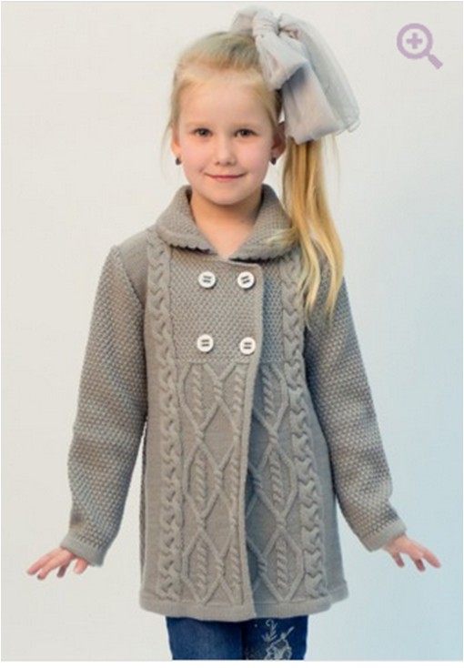 Пальто на четырех пуговицах с отложным воротником. Дополнено косами. Имитация ручной вязки