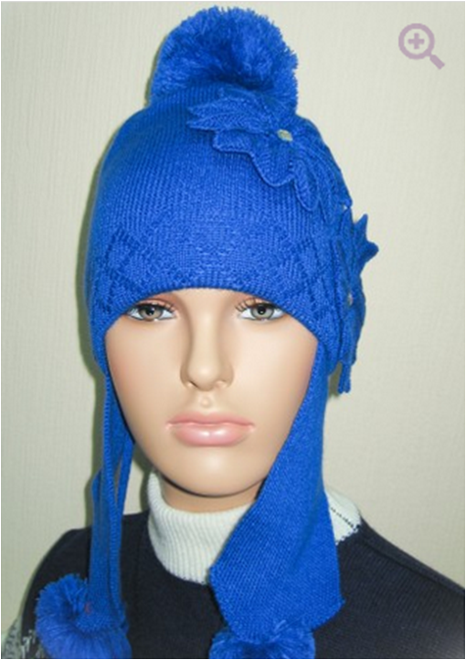 Шапка на флисе с длинными ушками, с тремя трикотажными бубонами, на завязках. Слева два больших цветка со стразами. Рекомендуется как детям, так и взрослым