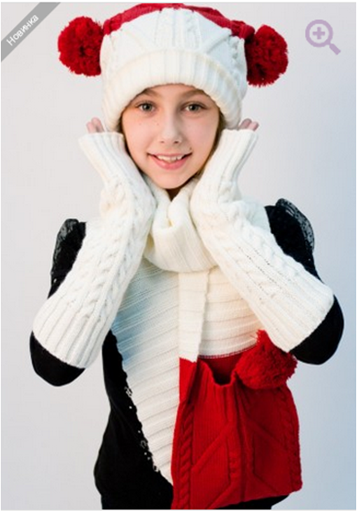 Комплект состоит из: шапки с двумя бубонами, шарфа с карманом и митенок. Весь комплект выполнен узором <<косы>>