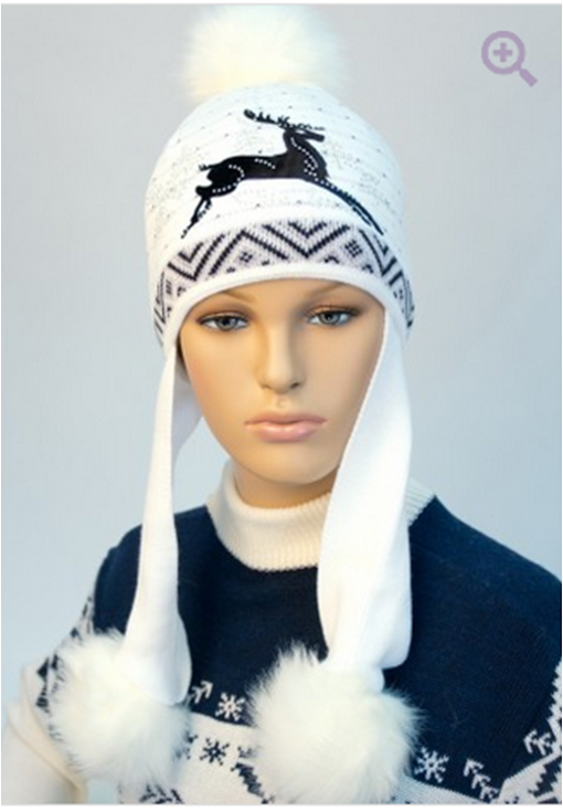Шапка на меху с тремя меховыми бубонами и длинными ушками. По центру бегущий бархатный олень со стразами и елочками