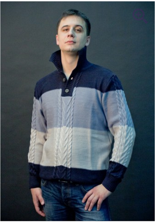 Свитер выполнен в трех цветах, горловина на планке с пуговицами, дополнен косами, связан в четыре нити