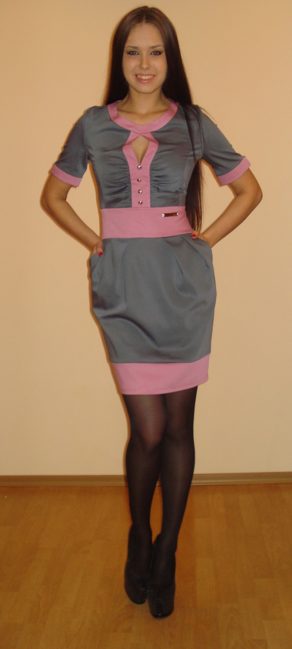 Ткань: костюмная облегченная. Элегантные платья серого цвета, комбинированные с коралловым и розовым цветами. Вырез в форме <<слезки>> переходит в планку с пуговицами, вдоль планки сборка по груди.