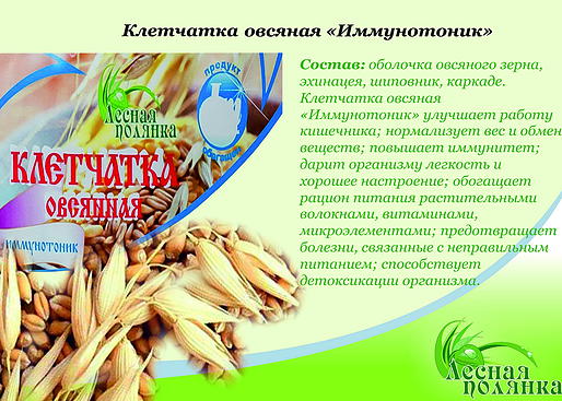 Пищевая ценность в 100г продукта: Энергетическая ценность 1523 кДж / 363 ккал Белок 17,9 г Жир 8,7 г Углеводы 44,1 г Пищевые волокна 19,0 г в том числе бета-глюкан 6,0 г Тиамин (витамин B1) 0,747 мг Фосфор 678 мг Железо 6,8 мг Магний 205 мг Цинк 4,7 мг Рекомендации к применению: За 30 мин. До еды. Смешать 1 - 2 ст. ложки клетчатки с не жирным кефиром, йогуртом, густым соком, киселем и т.д., настоять 2 - 3 мин. и выпить