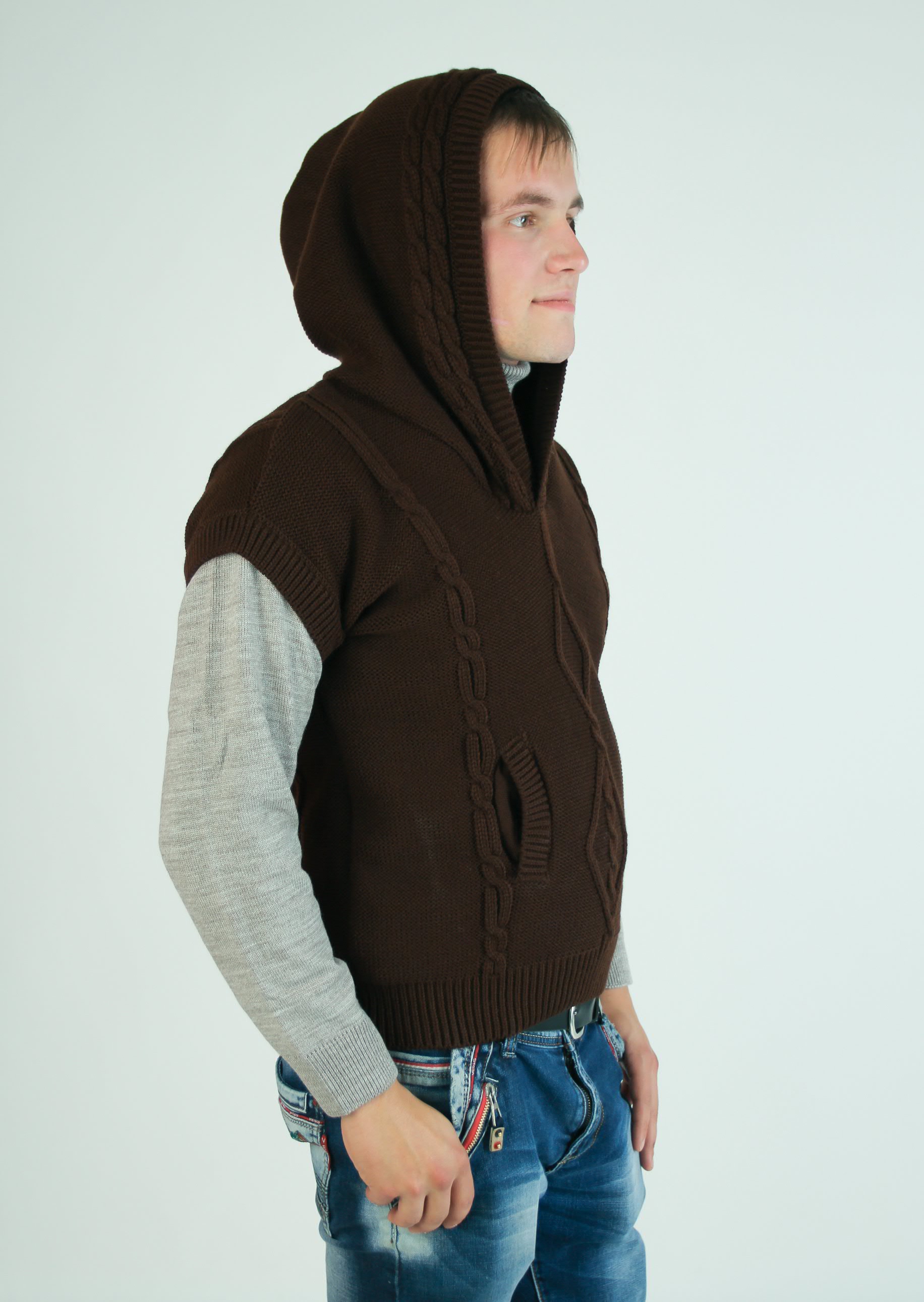 Спортивный жилет с прорезными глубокими карманами и широким капюшоном. Модель дополнена объемными косами.