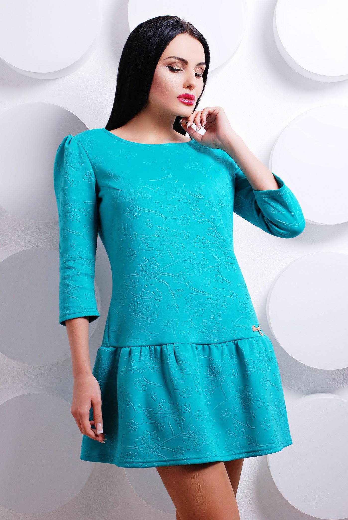 Очень нежное женское платье с отрезной юбочкой в виде широкой оборки по низу. Рукав 3/4, круглая горловина.
