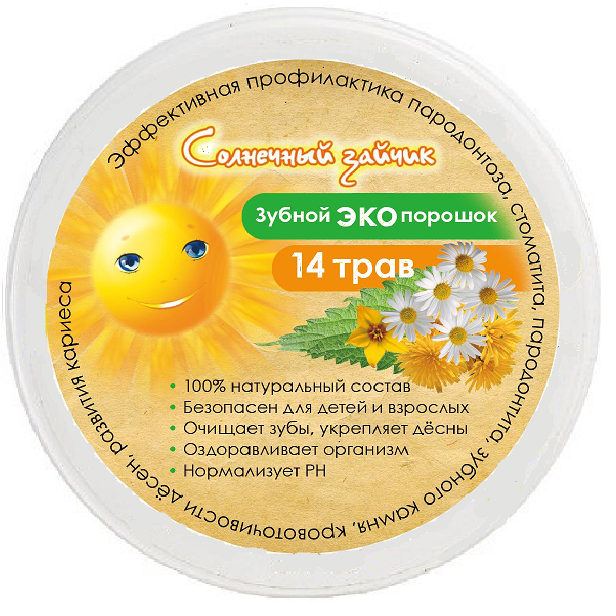 Зубной травяной порошок Солнечный зайчик - это 100 % натуральное, экологичное и без абразивное средство гигиены полсти рта. Не повреждает и не царапает эмаль зубов. Прекрасно подходит для чувствительных зубов.