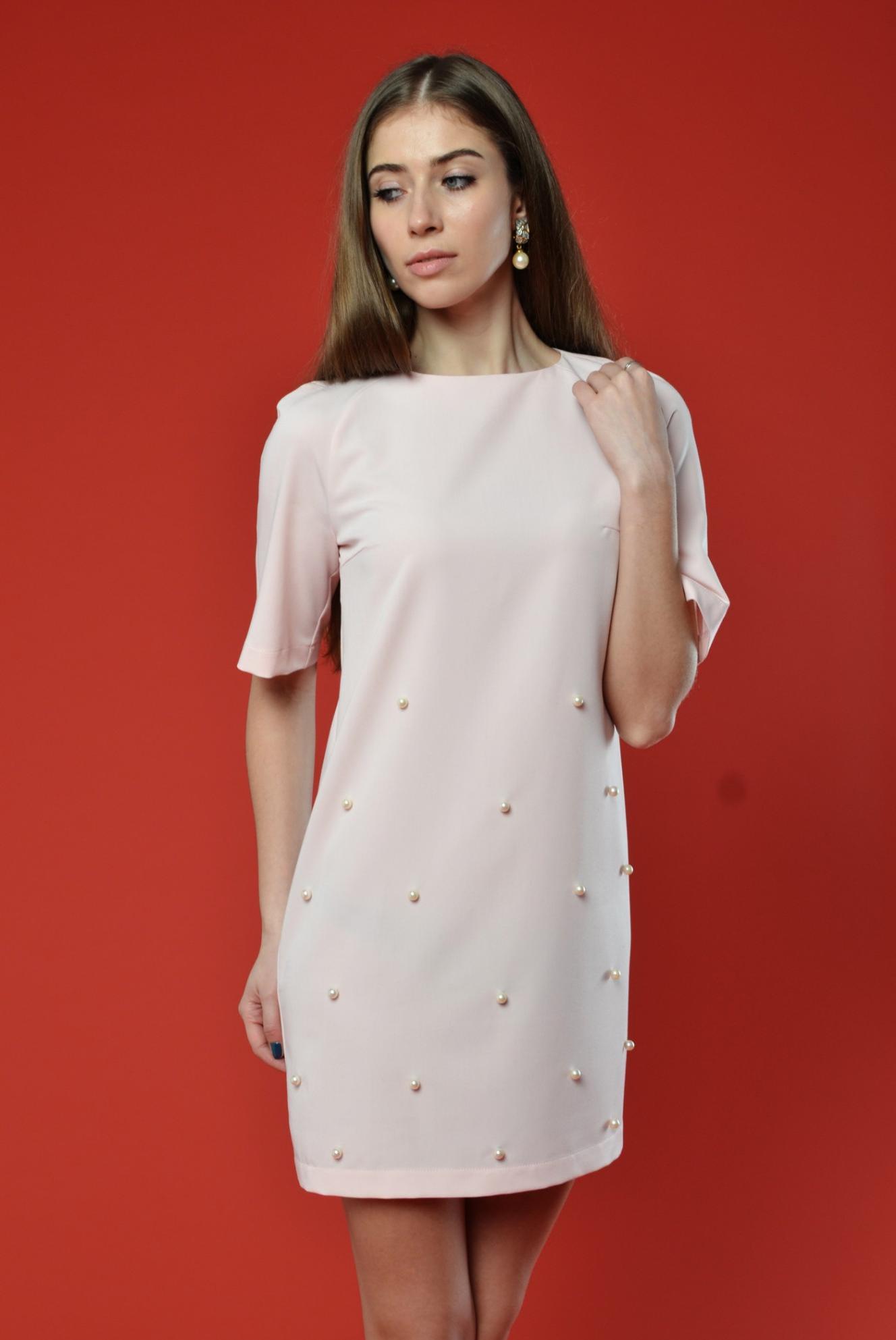 Нарядное женское платье с бусинами. Платье прямого силуэта изготовлено из костюмной ткани. Сзади потайная молния. Украшено жемчужинами белого цвета.