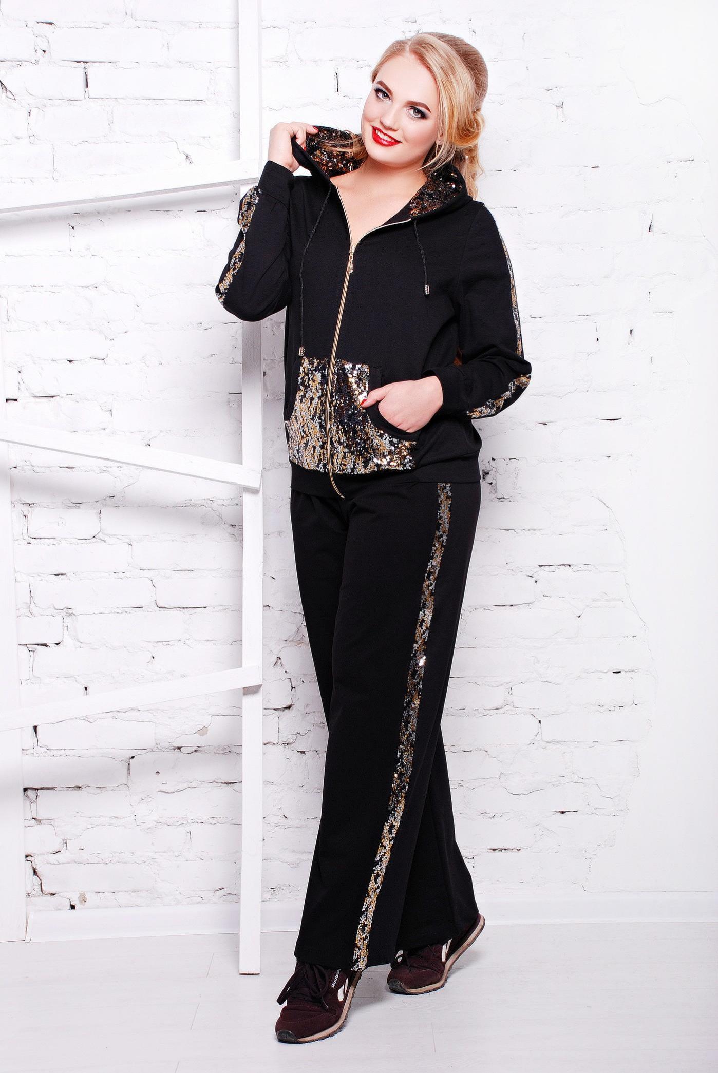 Спортивный костюм из качественного трикотажа двойного плетения - куртка на змейке с капюшоном + брюки с лампасами. Изюминка костюма - вставки (лампасы) на рукавах и брюках из ткани с пайетками бронзового и серебристого цвета, такой же тканью декорирована внутренняя поверхность капюшона. Брюки - прямого покроя с небольшим напуском на обувь. Длина изделия (куртка): 67 см. Длина рукава (куртка): 64 см. Длина по боковому шву (брюки): 109 см. Длина по внутреннему шву (брюки): 82 см.
