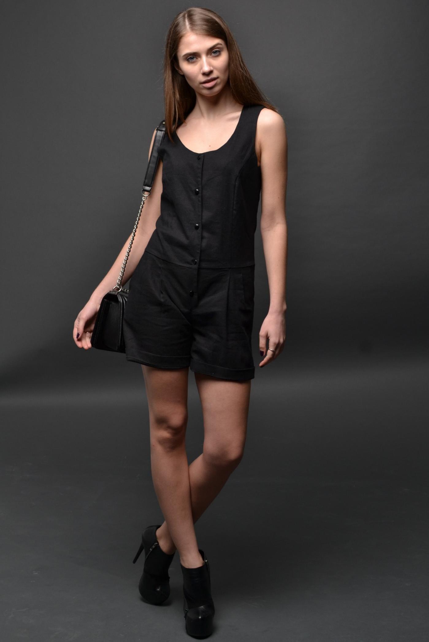 Стильный женский комбинезон черного цвета. Выполнен из высококачественного итальянского льна. Натуральная дышащая ткань прекрасный вариант для лета. Хорошо садится на любой тип фигуры. Шорты свободного кроя, со складами по переду и карманами в боковых швах. Сзади имеют имеет место прорезной карман с листочкой. Застегивается изделие на центральную застежку петли пуговицы. По низу шорт манжеты. Длина изделия в 42 размере 85см, длина шорт 35 см.
