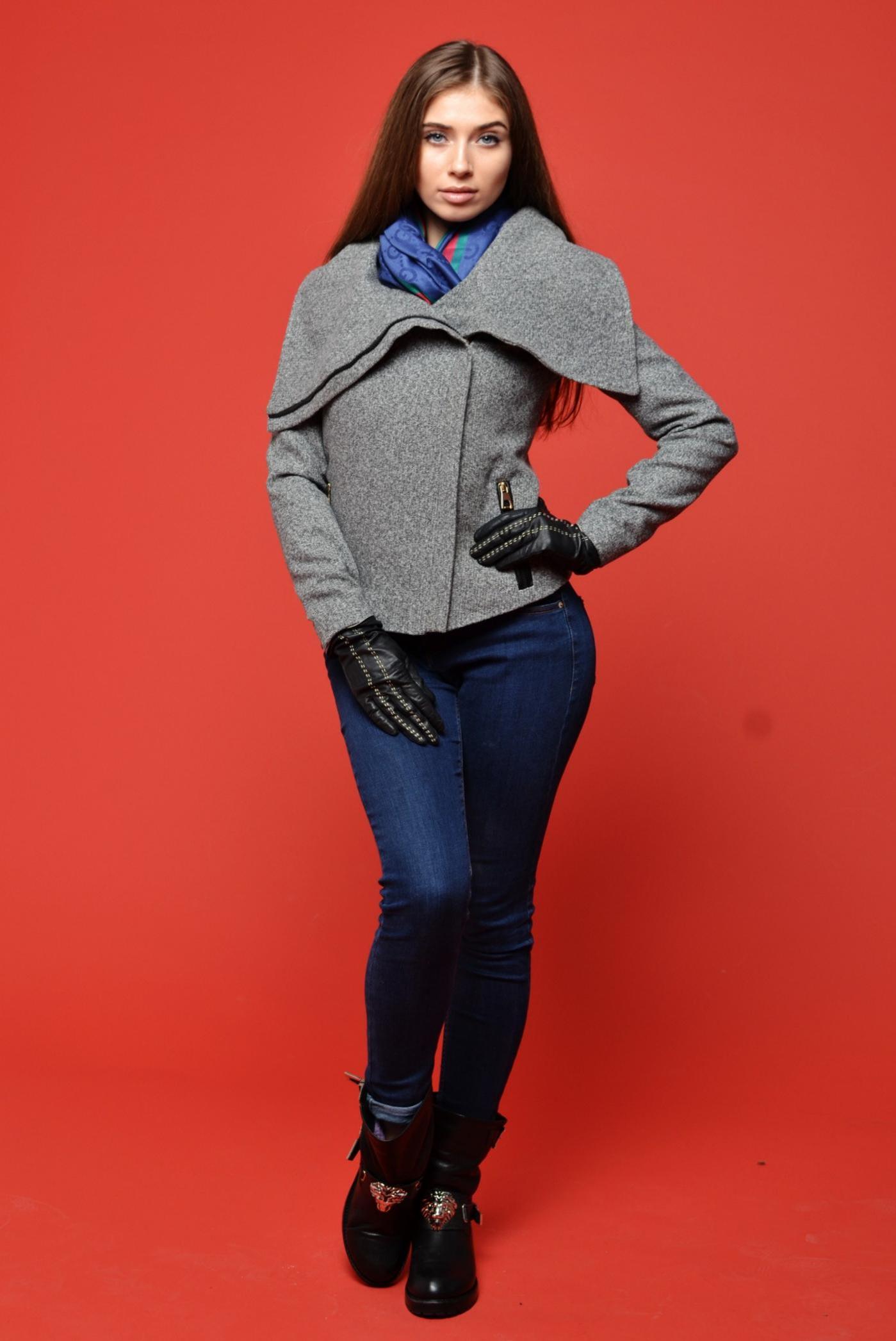 Стильная женская куртка выполнена из плотной пальтовой ткани . Изделие на подкладке, с двумя прорезными карманами на молниях. Спереди ассиметричная застежка со змейкой черного цвета. Креативный воротник позволяет моделировать изделие на свой вкус. Длина рукава 61 см , длина изделия 59 см.
