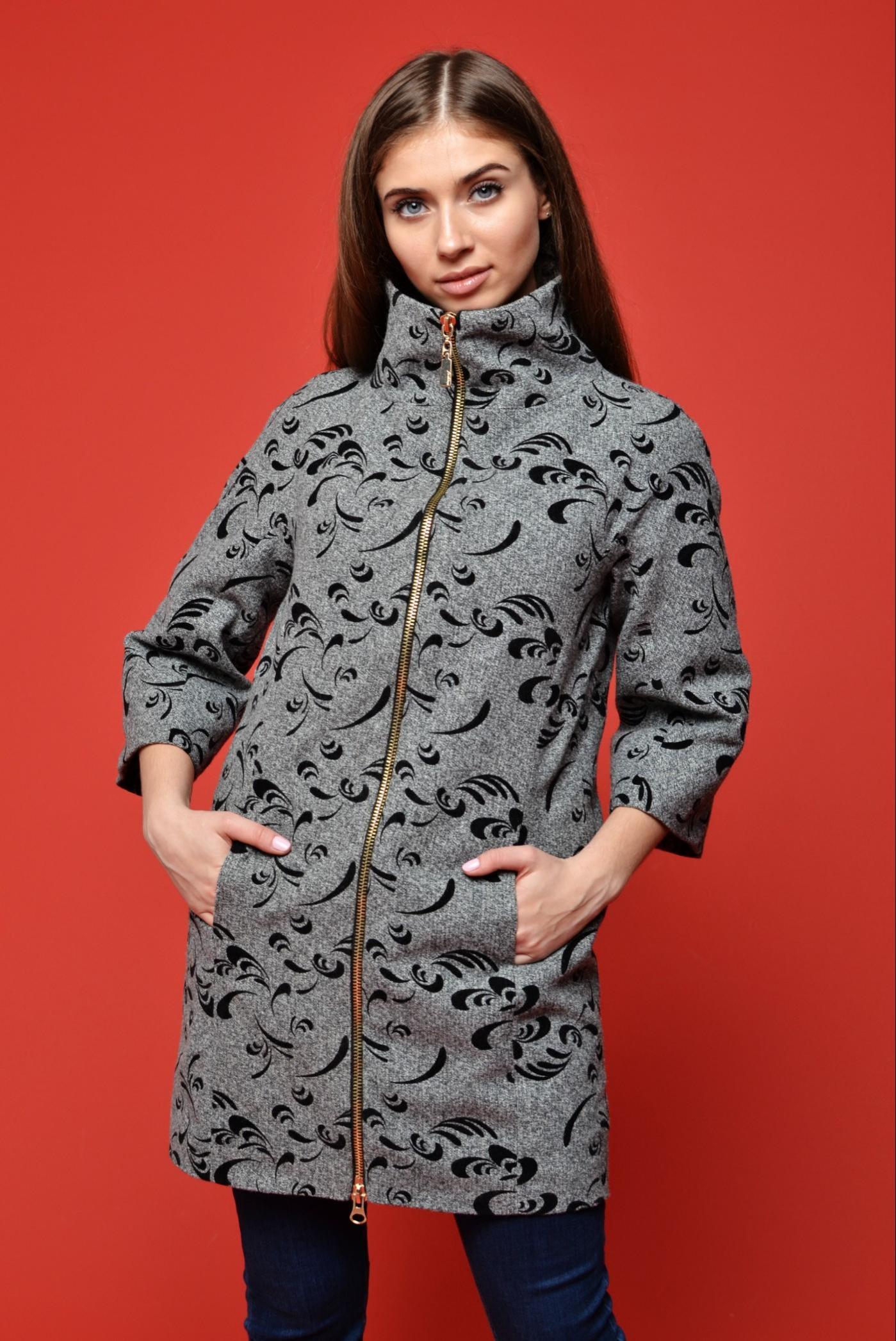 Женское пальто выполнено из пальтовой ткани с черным принтом. Изделие с цельновыкроенным рукавом длиной до локтя, высоким воротником-стойка и двумя карманами в швах. Застежка на змейку черного цвета. Пальто на подкладке. Длина длина 82см во всех размерах.