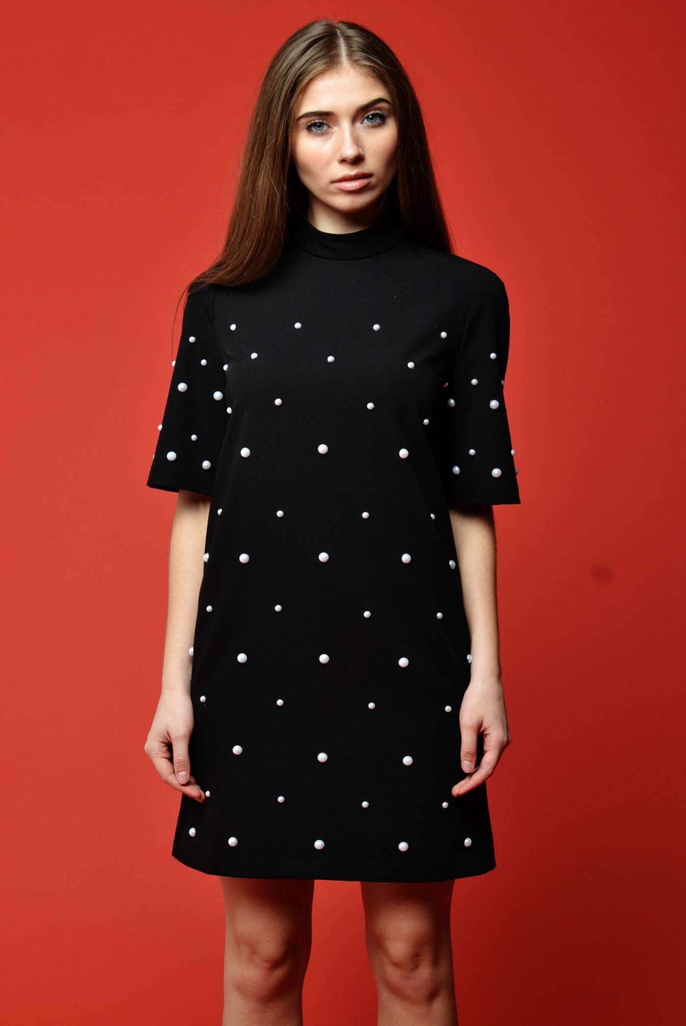Женское платье с бусинами. Платье прямого силуэта изготовлено из костюмной ткани. Сзади потайная молния. Украшено половинками жемчужин белого цвета. Длина изделия в 42 размере составляет 87см. Длина меняется на 2см.