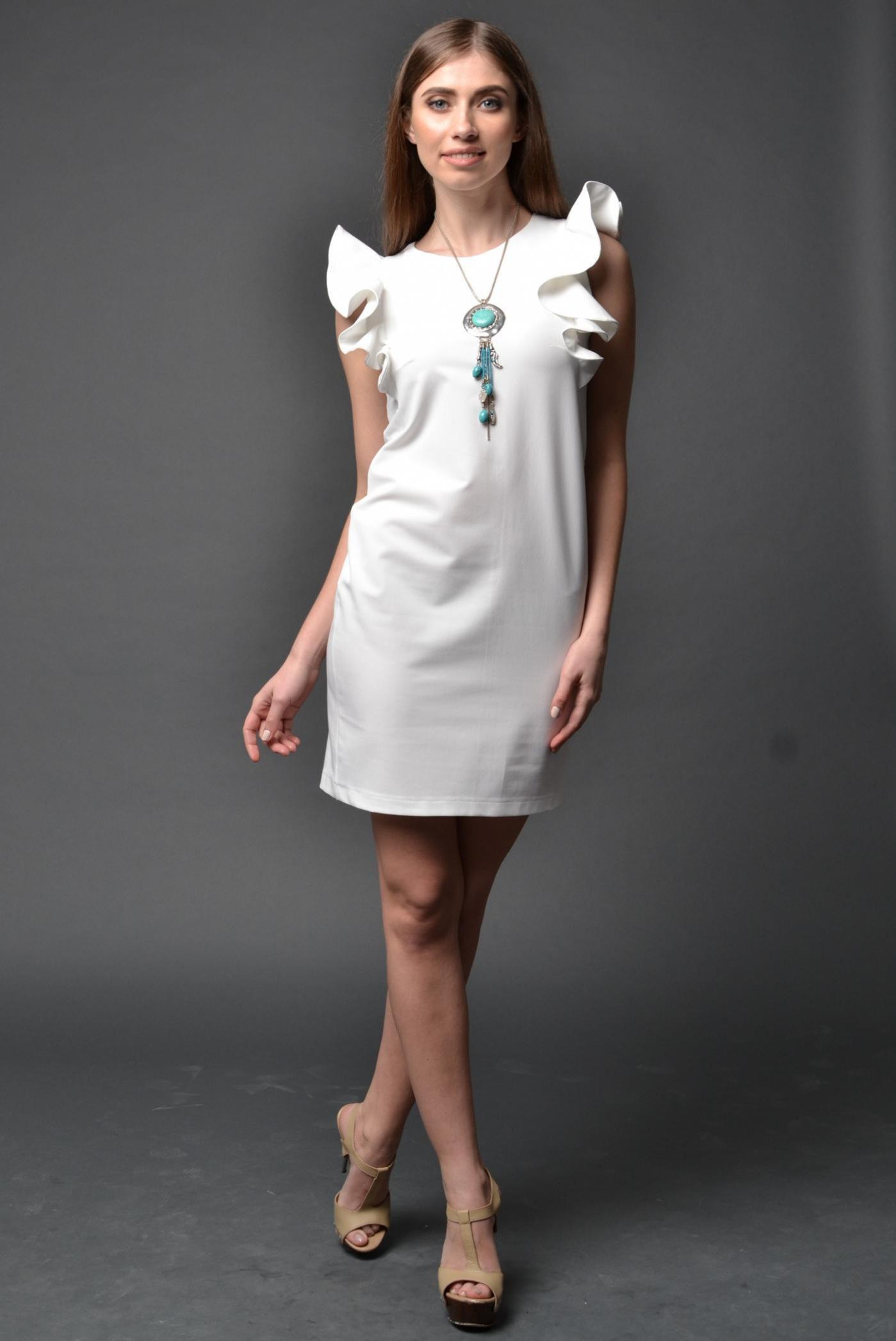 Платье прямого силуэта с красивым рукавом - крылышком. Выполнено из высококачественной костюмной ткани. Свободный крой позволяет скрыть недостатки фигуры. На спинке потайная тесьма - (змейка). Длина изделия в 42 размере составляет 87см. меняется от размера к размеру на 2 см. Аксессуары в комплекте не идут.