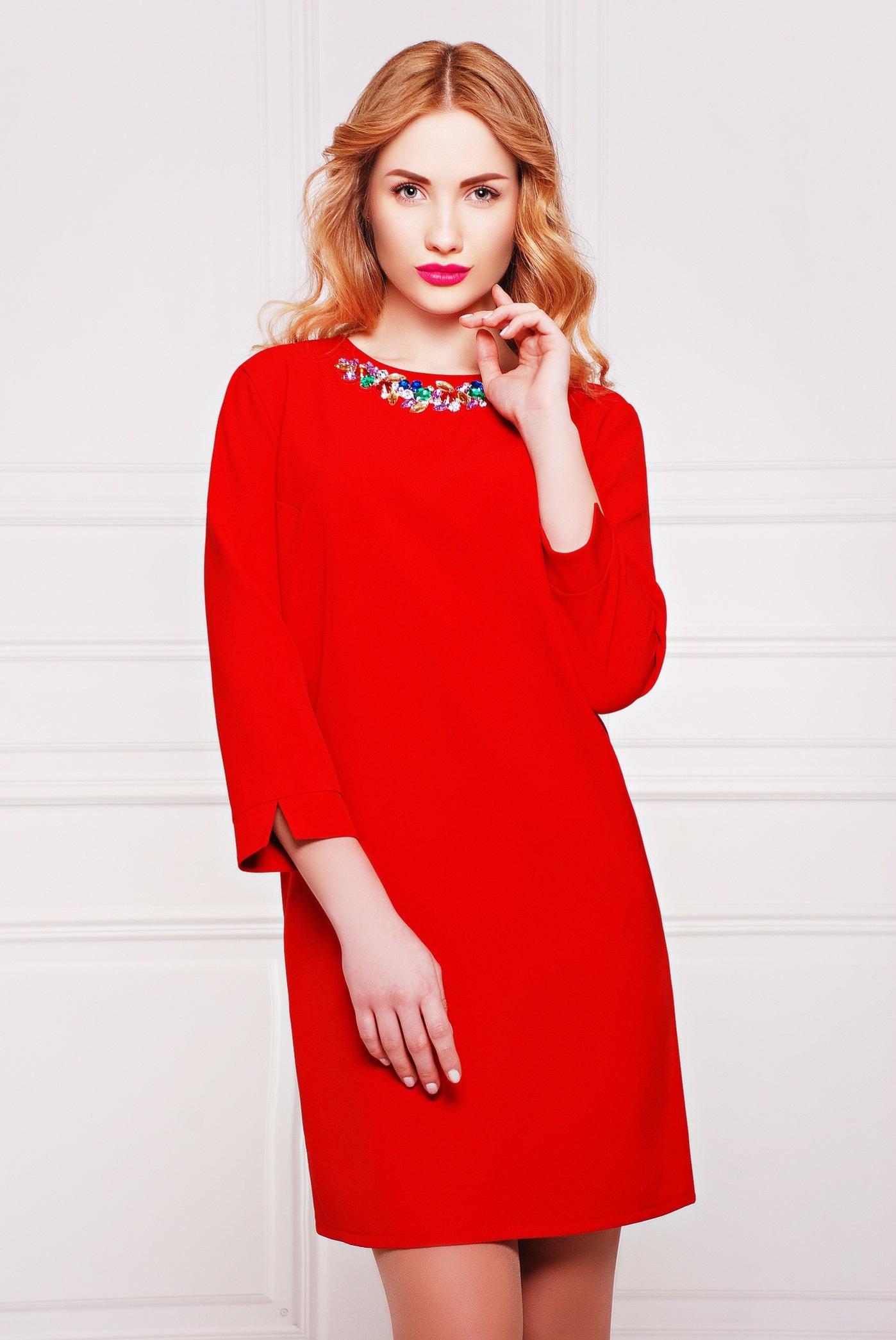Платье длиной до колена прямого фасона с рукавом 7/8. Рукава втачные, прямые со свободными манжетами. Платье без лишних деталей. Великолепным украшением его является ожерелье с яркими камнями под самоцветы.