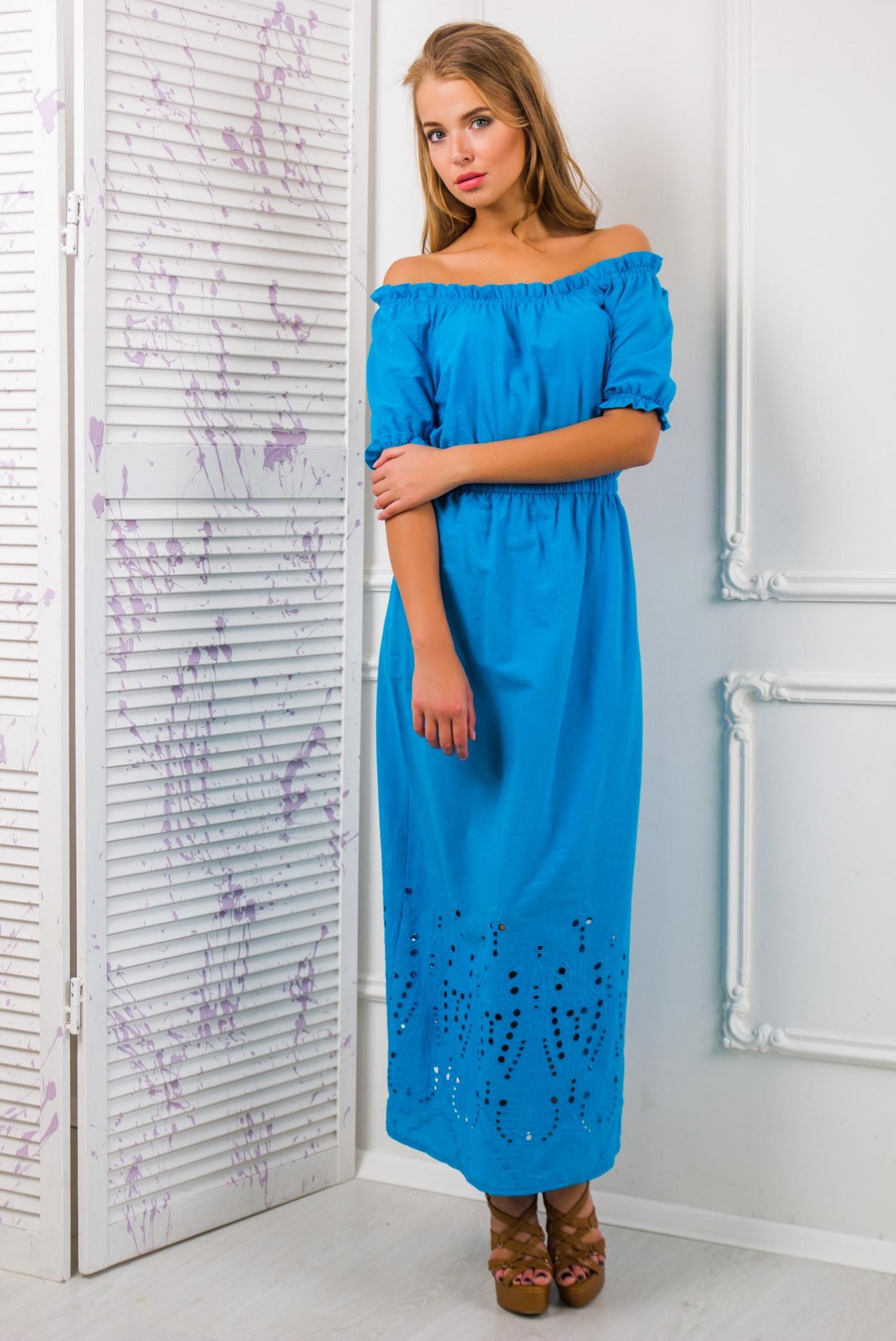 Очень красивое крупное шитье по низу платья. Платье присборено по верху, на рукавах и поясе. Сборка сверху позволяет носить платье с открытыми плечами. Натуральный хлопок и крупный ажурный декор даже при такой длине позволяет Вам чувствовать себя комфортно даже в самый жаркий день.