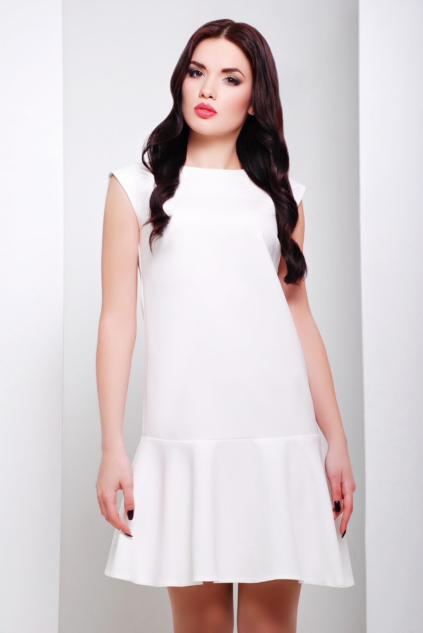 Короткое платье без рукавов А-образного силуэта с широким воланом, скроенным по косой по низу изделия. Очень красивая спинка платья - глубокий вырез дополнен бантом, который одновременно и украшает его и скрывает застежку нижнего белья. Платье стильное, нарядное и одновременно простое - подойдет для вечеринки или для торжественного случая.