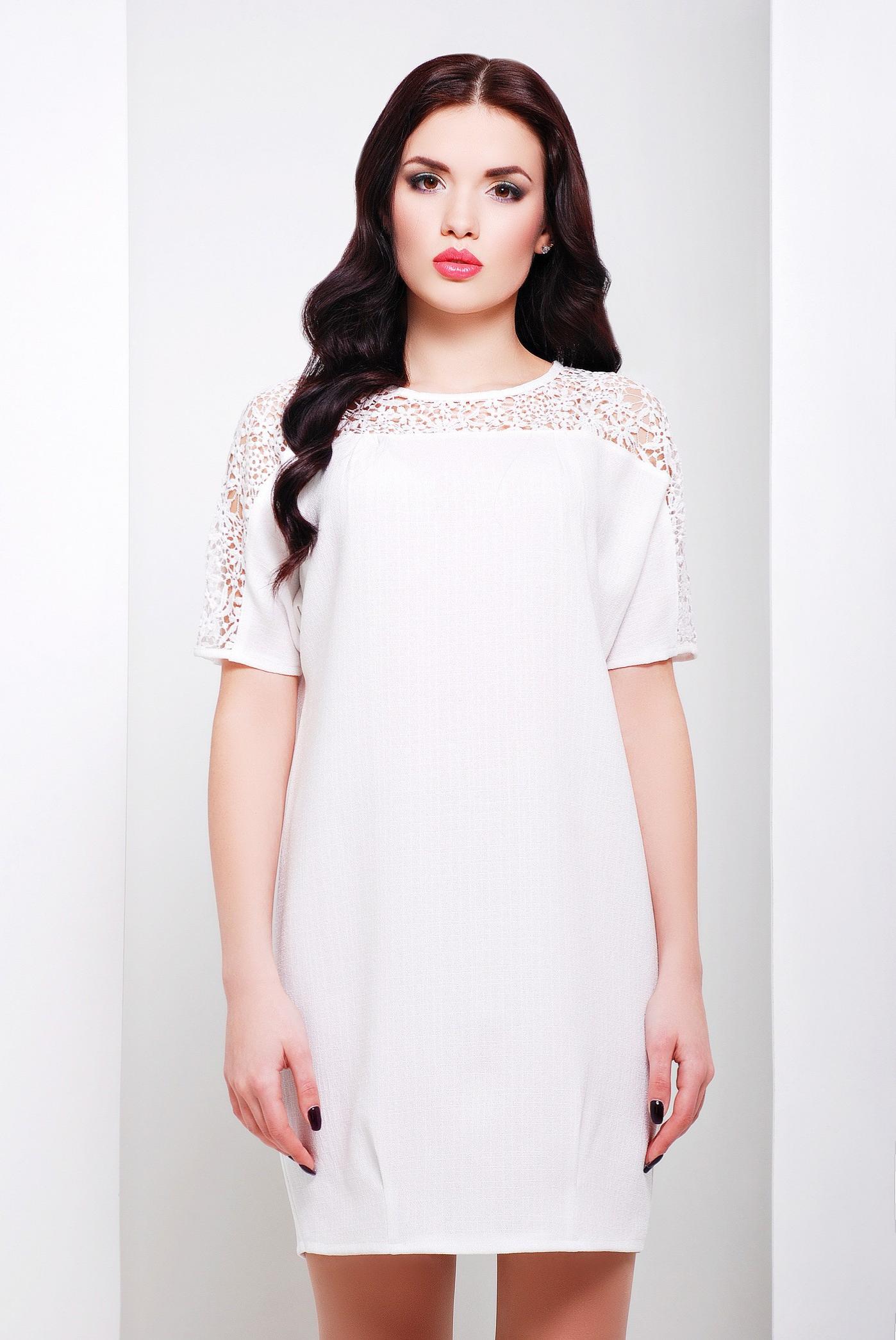 Коктейльное однотонное платье до колена прямого фасона с цельнокроенным рукавом. Изюминкой платья является декор по верхнему шву рукава из качественного кружева и V-образный глубокий вырез на спине.